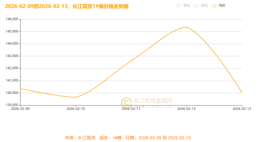 本周(2月9日至13日)长江现货市场1#镍价呈“倒V型”剧烈震荡,全周虽微涨670元/吨、本周累计总均价报141600元/吨,但振幅显著。价格在前半周快速拉涨,尤其12日冲高至周内峰值145,350元/吨,较9日低点累计上涨5,000元/吨;然而13日单日暴跌5,300元/吨,几乎回吐全部周内涨幅,反映市场情绪由短时追高迅速转为集中抛售。此轮过山车行情显示镍价在当前位置支撑薄弱,市场对高位价格持续缺乏信心,波动可能受资金面获利了结、宏观情绪变化及下游节前采购节奏共同影响。