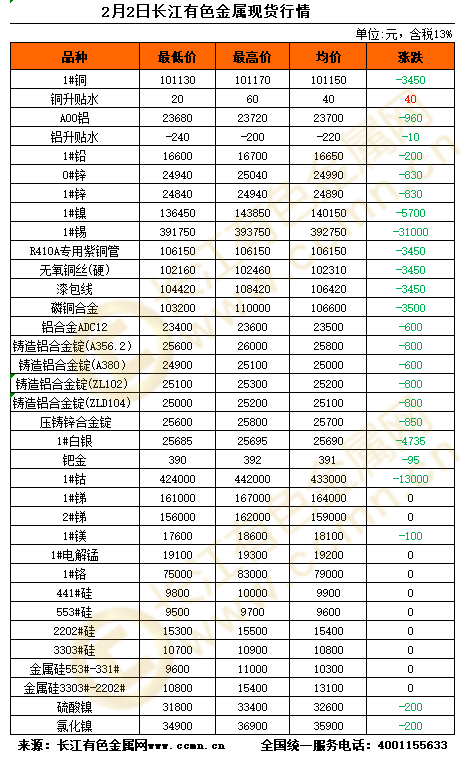 长江有色金属网 > 资讯首页 > 行业要闻 > 2月2日长江有色金属现货行情